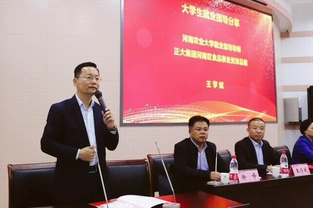 王學(xué)斌***總裁講述了自己的奮斗歷程,并結(jié)合自身經(jīng)歷和正大集團(tuán)事業(yè)規(guī)劃,為在場畢業(yè)生做就業(yè)指導(dǎo)報(bào)告。為大家的就業(yè)選擇提供指導(dǎo),提醒同學(xué)們選擇自己適合的工作。