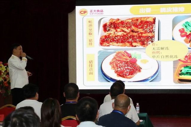 注冊中國烹飪大師、洛陽正大食品研發(fā)廚務總監(jiān)張立新先生向團餐大會介紹了洛陽正大食品開發(fā)的十余款預制豬肉調(diào)理產(chǎn)品,并從后廚實操角度分享了產(chǎn)品特色和賣點,逐一介紹了出餐加工標準和配餐流程。