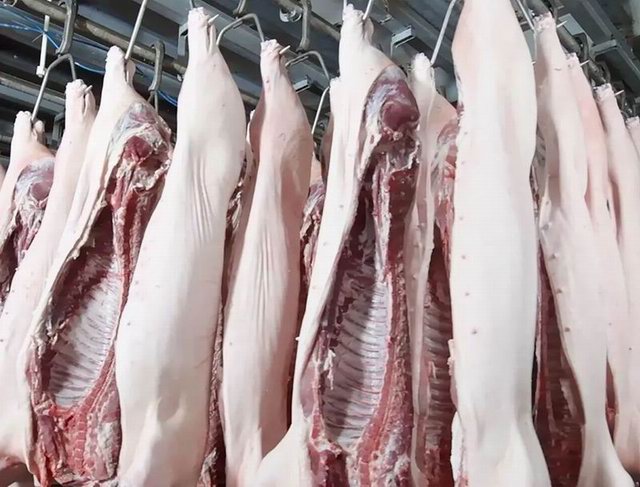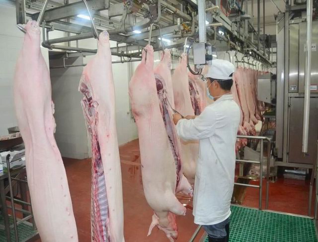 毛豬車輛入廠時嚴(yán)格車輪消毒池和人員專用通道消毒;卸車后經(jīng)過清洗、消毒、烘干等環(huán)節(jié)徹底消殺后方可出廠,確保安全;