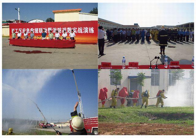 洛陽(yáng)市安監(jiān)局領(lǐng)導(dǎo)、洛陽(yáng)市消防支隊(duì)領(lǐng)導(dǎo)、區(qū)領(lǐng)導(dǎo)迅速趕赴現(xiàn)場(chǎng)指揮救援,8臺(tái)消防車、2臺(tái)救護(hù)車在公安交警車開(kāi)道下呼嘯而至,120名消氣防戰(zhàn)斗員訓(xùn)練有素展開(kāi)救援,生產(chǎn)調(diào)整組、安全環(huán)保組、警戒保衛(wèi)組、設(shè)備搶修組、信息管理組共50人分別按預(yù)案井然有序開(kāi)展現(xiàn)場(chǎng)工作。由于反應(yīng)迅速,處置得當(dāng),沒(méi)有造成周圍水體、空氣環(huán)境污染,沒(méi)有發(fā)生其他次生事故,1名中毒的現(xiàn)場(chǎng)操作人員得到及時(shí)救治。本次演練為力求貼近實(shí)戰(zhàn),對(duì)突發(fā)事故應(yīng)急處理真正起到指導(dǎo)和演練作用,改變以往演練模式,應(yīng)急指揮部演練中還臨時(shí)增設(shè)了演練科目。