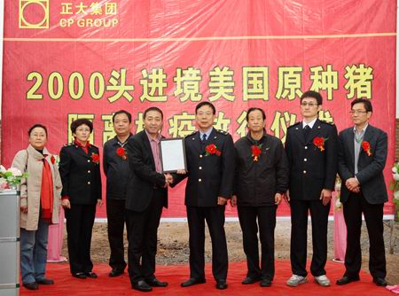 放行儀式上,陜西出入境檢驗(yàn)檢疫局代表做了檢疫放行報(bào)告:“經(jīng)過3個多月的隔離檢驗(yàn),正大集團(tuán)農(nóng)牧食品企業(yè)(中國區(qū))引進(jìn)的2000頭原種豬完全符合安全檢疫標(biāo)準(zhǔn),準(zhǔn)予放行。”陜西出入境檢驗(yàn)檢疫局代表為正大集團(tuán)陜西區(qū)陳強(qiáng)總裁頒發(fā)了《種豬檢疫合格證書》。