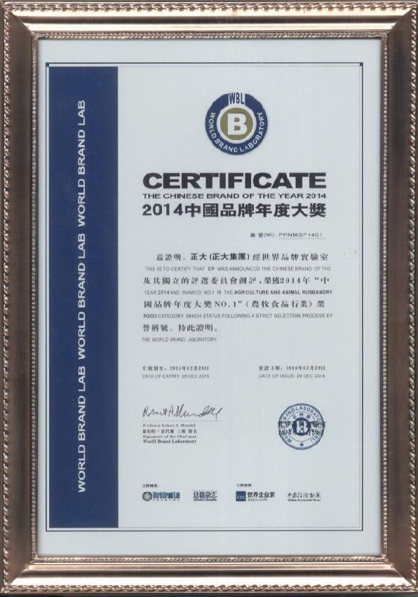 2014年12月29日,“總裁世界年會”在北京東方君悅大酒店舉行。本次大會揭曉了享有“中國品牌奧斯卡”之稱的 “世界品牌實(shí)驗室2014年中國品牌年度大獎”評選結(jié)果,正大集團(tuán)、中國國航、國家電網(wǎng)、騰訊控股、中國人壽、中國國旅、北汽集團(tuán)、華為技術(shù)、長虹電器等30個活躍在中國經(jīng)濟(jì)舞臺的領(lǐng)軍品牌榮獲 “中國品牌年度大獎”,正大集團(tuán)以在農(nóng)牧食品業(yè)多年的探索實(shí)踐和管理經(jīng)驗,以及良好的產(chǎn)品品質(zhì)和品牌知名度,榮獲農(nóng)牧食品行業(yè)“中國品牌年度大獎***”榮譽(yù)稱號。哈佛商學(xué)院教授約翰?戴騰博士(John Deighton)、耶魯大學(xué)管理學(xué)院教授萊維·多爾博士(Ravi Dhar)分別進(jìn)行頒獎及致詞。